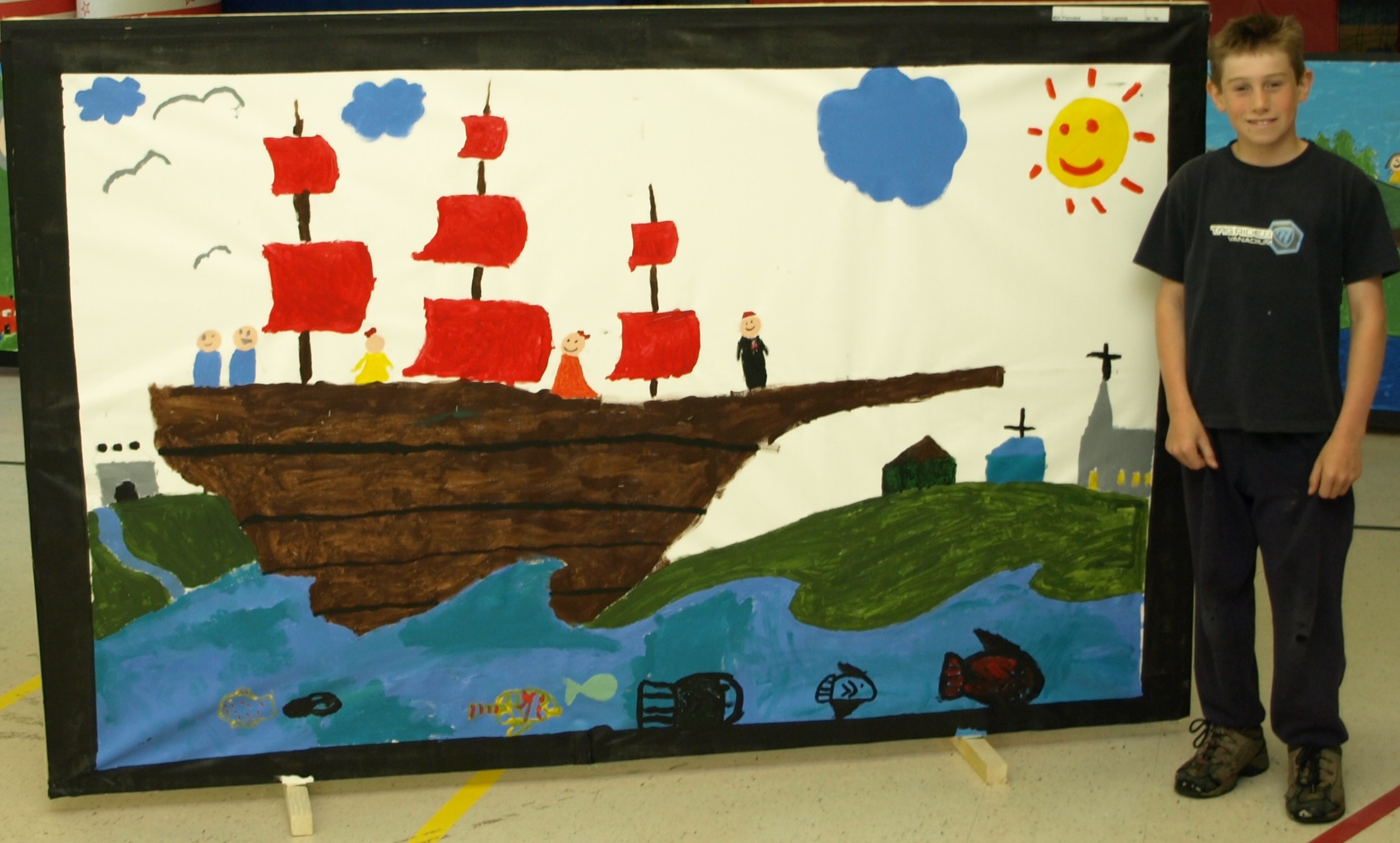 Lors d’une deuxième rencontre un atelier interactif a été offert aux élèves pour leur faire découvrir l’histoire de leur région à travers la vie et les réalisations de François de Laval. Ensuite, un thème a été choisi selon ce qui a marqué les élèves dans cet atelier. Pour chacune des écoles, des oeuvres collectives ont été réalisées par les élèves sur les panneaux selon leur thème choisi.